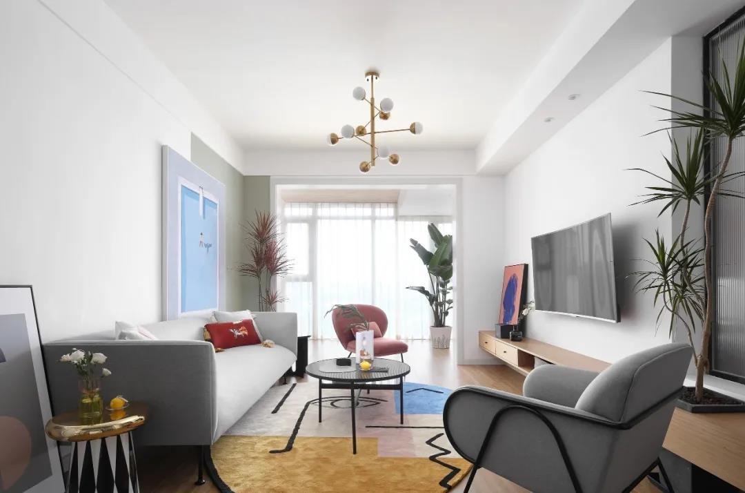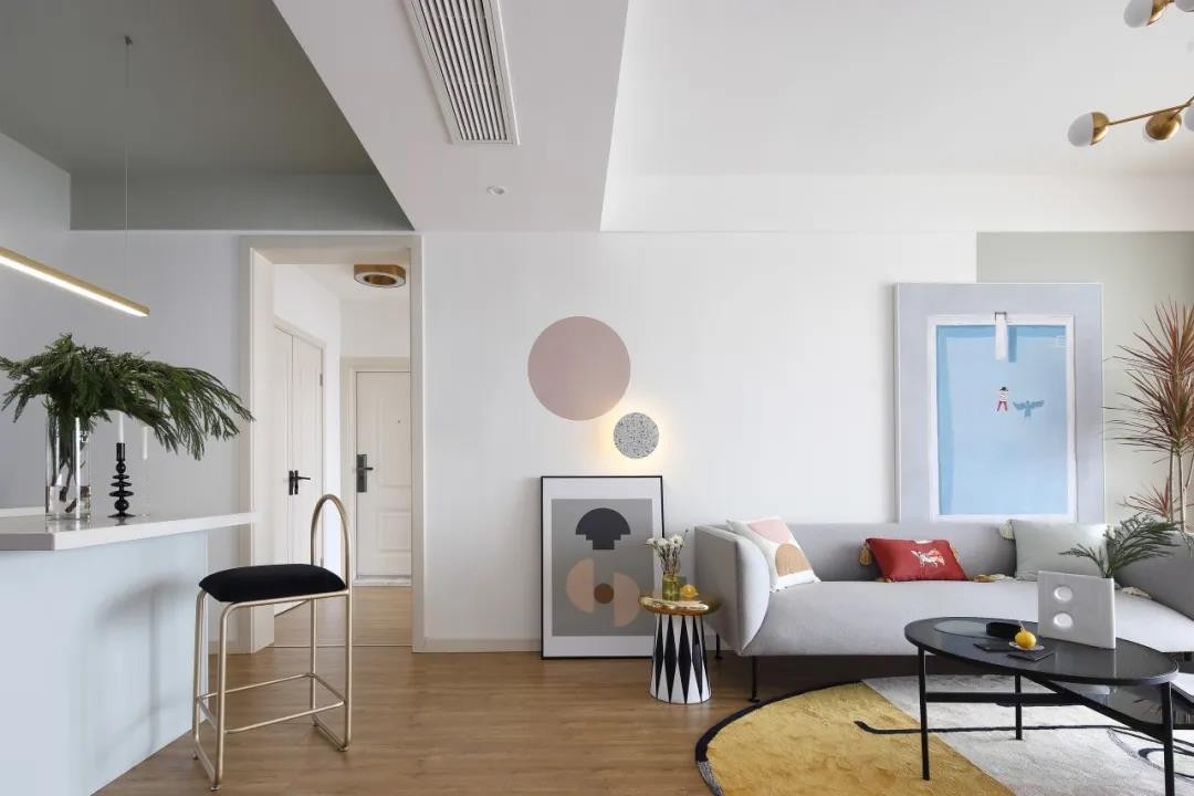 沙發墻潔凈的墻面加入白色與灰色的雙色設計,掛放一幅極簡的掛畫,左側還有兩盞圓形的壁燈?;疑妓嚿嘲l,還有鮮艷活