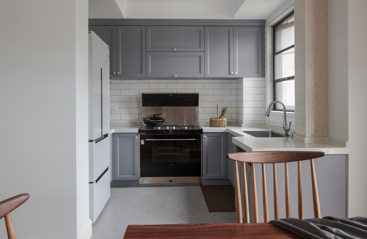 因廚房原來(lái)的面積本來(lái)就較小,為了改善這個(gè)問(wèn)題,我們還是采用了開(kāi)放式廚房。整個(gè)區(qū)域與餐廳區(qū)域結(jié)合,這里不做區(qū)隔,方便媽媽做菜的時(shí)候,可以和餐廳的人進(jìn)行互動(dòng)。 當(dāng)然,開(kāi)放式廚房,有一個(gè)小建議,因?yàn)槌床擞蜔煹膯?wèn)題,建議購(gòu)買(mǎi)大功率吸油煙機(jī)。房東買(mǎi)的集成灶,既節(jié)省空間,也方便使用。因?yàn)槭占{空間足夠,所以平常不使用的時(shí)候,臺(tái)面也可以保持整潔如新。