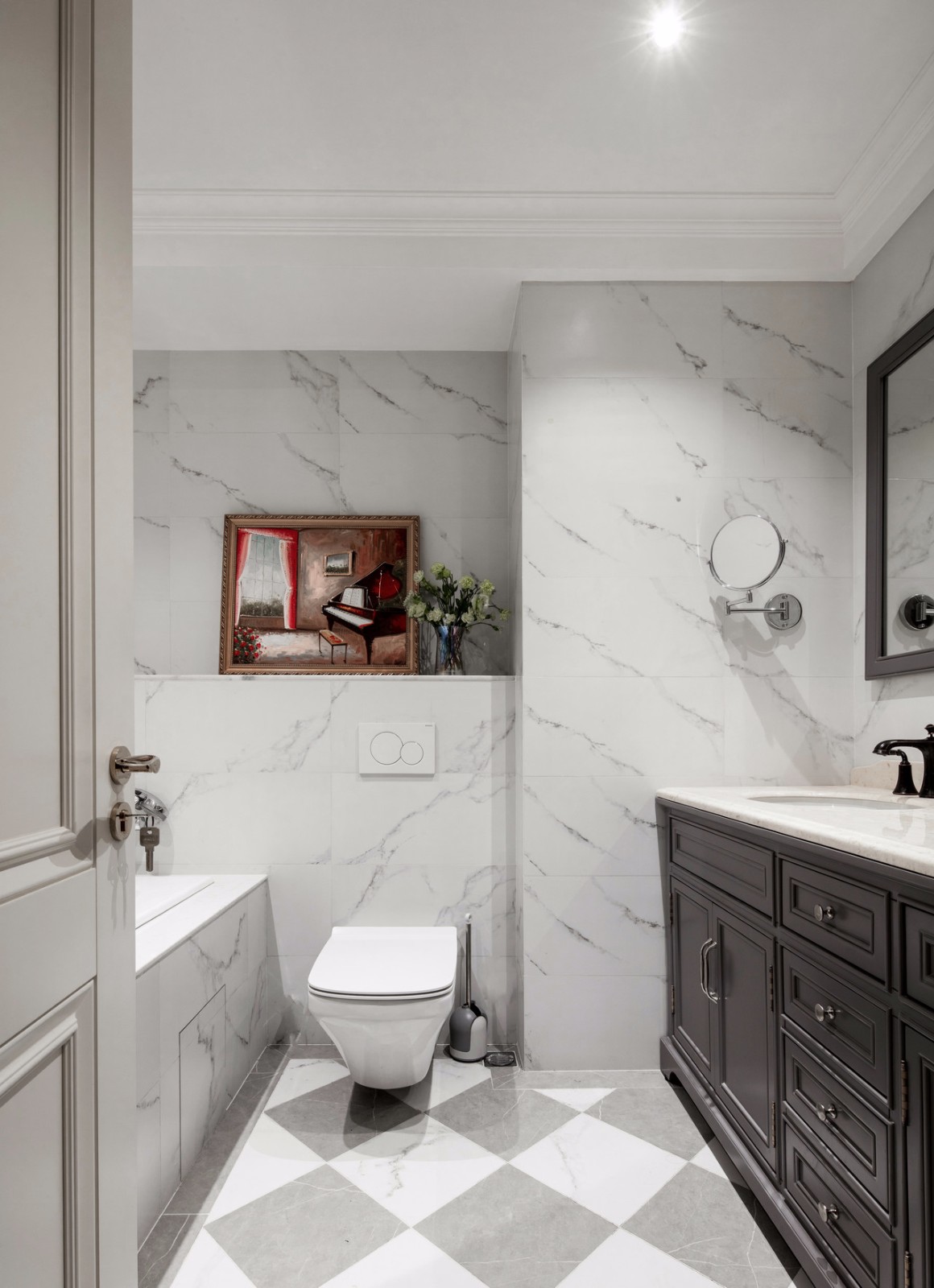 主臥的衛(wèi)生間滿(mǎn)足了房東的要求,浴缸+梳洗臺(tái)+儲(chǔ)物柜+馬桶全部都有。因?yàn)樵谥髋P,可以滿(mǎn)足泡澡需求而不被打擾,大概牙醫(yī)日常用來(lái)放松的場(chǎng)所。 墻面和浴缸表面均采用同樣花紋大理石,不規(guī)則的灰色紋路隨意點(diǎn)綴,任意而妄為;地上的大理石采用菱形灰白大理石,與墻體做呼應(yīng)。墻上的裝飾畫(huà),我個(gè)人很喜歡,使整個(gè)使用空間格調(diào)迅速提高。