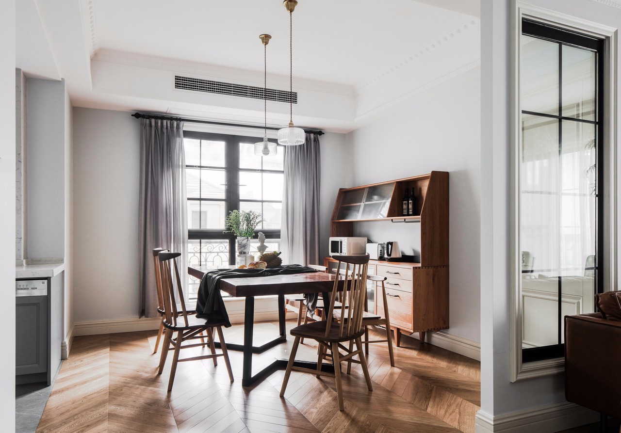 因日常只有三人食用,菜品不會(huì)很多,偶爾會(huì)有父母做客,滿(mǎn)足房主想要的長(zhǎng)行餐桌(正好滿(mǎn)足五人食用,空間不會(huì)擁擠) 餐桌后面我又放置了一個(gè)儲(chǔ)物柜,色調(diào)與餐桌一致,兼顧了美感和平衡感。可以放置很多廚房放不下的東西(滿(mǎn)足房主喜歡東西擺放整齊的要求)