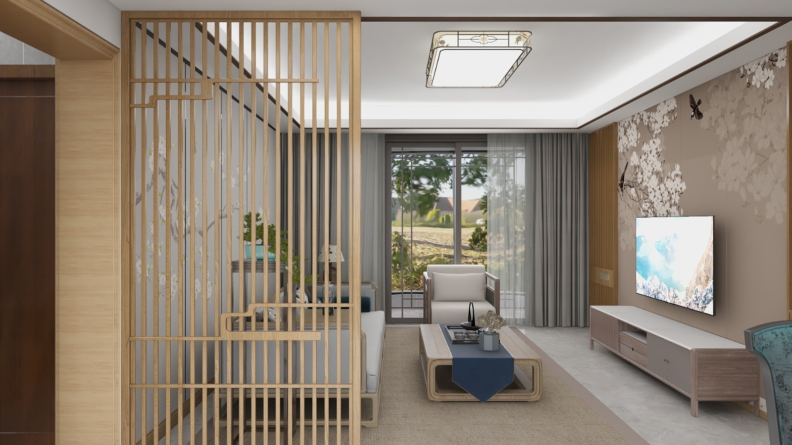 沙發背景墻融入了中式的意境與電視背景墻向虎銀,襯托出中式的韻味。