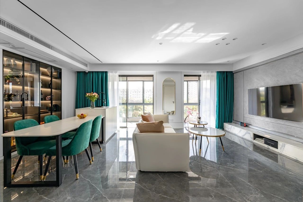 整體以灰白為主,用墨綠、橙色、金屬元素作為點(diǎn)綴,勾勒出空間層次的線條感,營造一種活潑輕松的氛圍