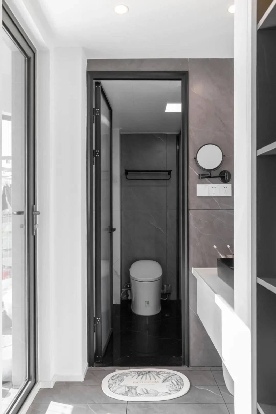 衛(wèi)生間與小陽臺(tái)之間用玻璃門分隔,增加暗衛(wèi)的采光和通透性。