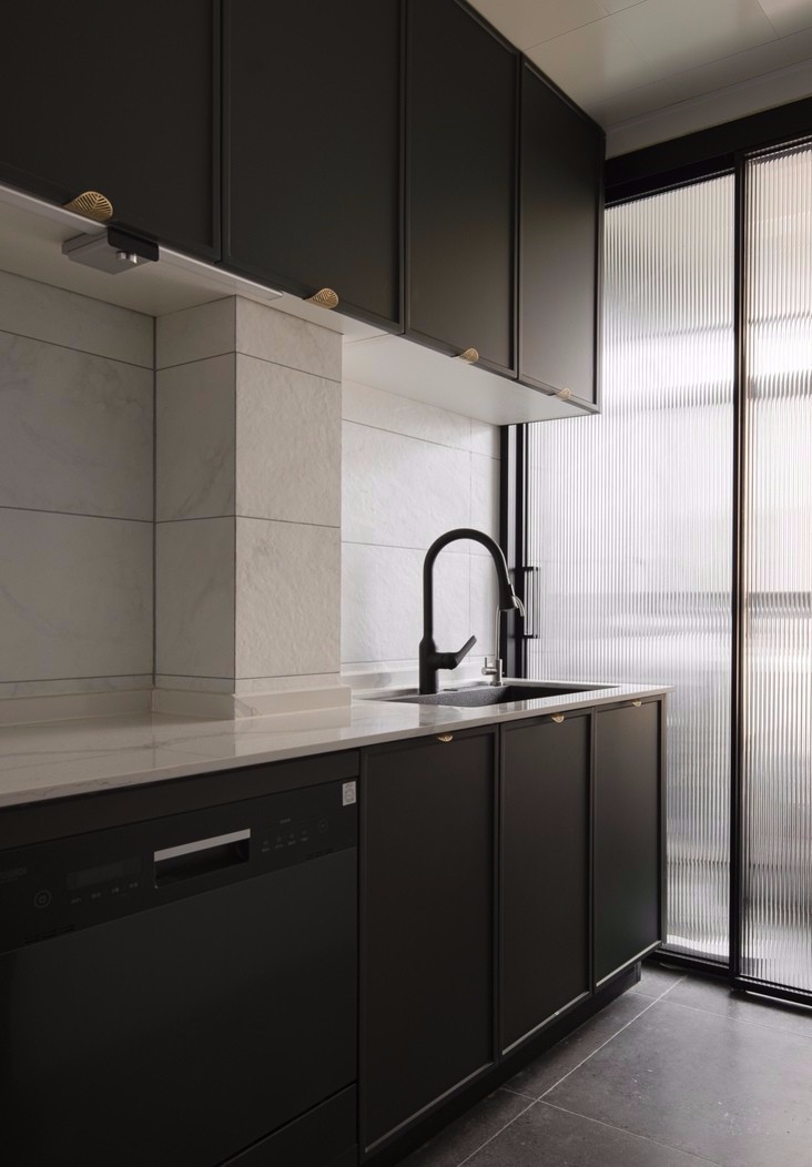 由客廳望向餐廳。客餐廳公共空間以白色為主色調,點綴貫穿全屋的粉和綠。餐邊柜旁的門神,守護陪伴著一家三口,也為這個家注入了更多年輕活潑的元素。